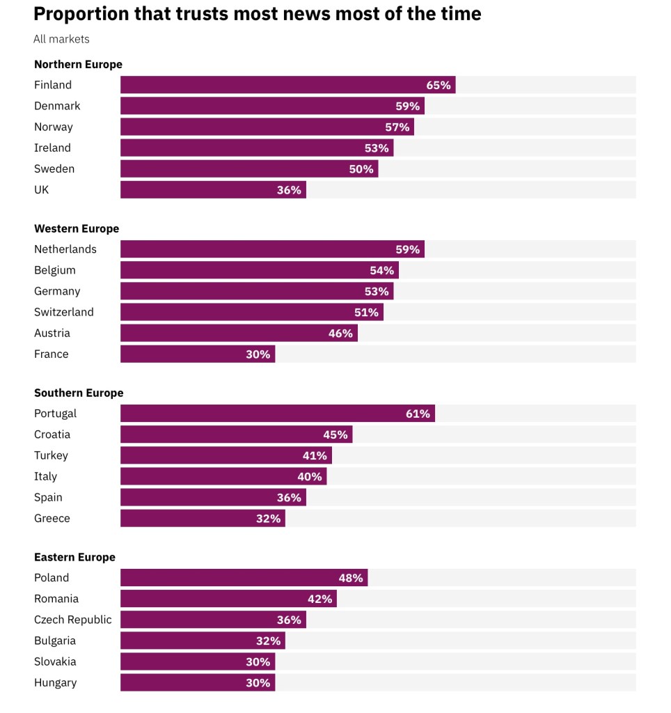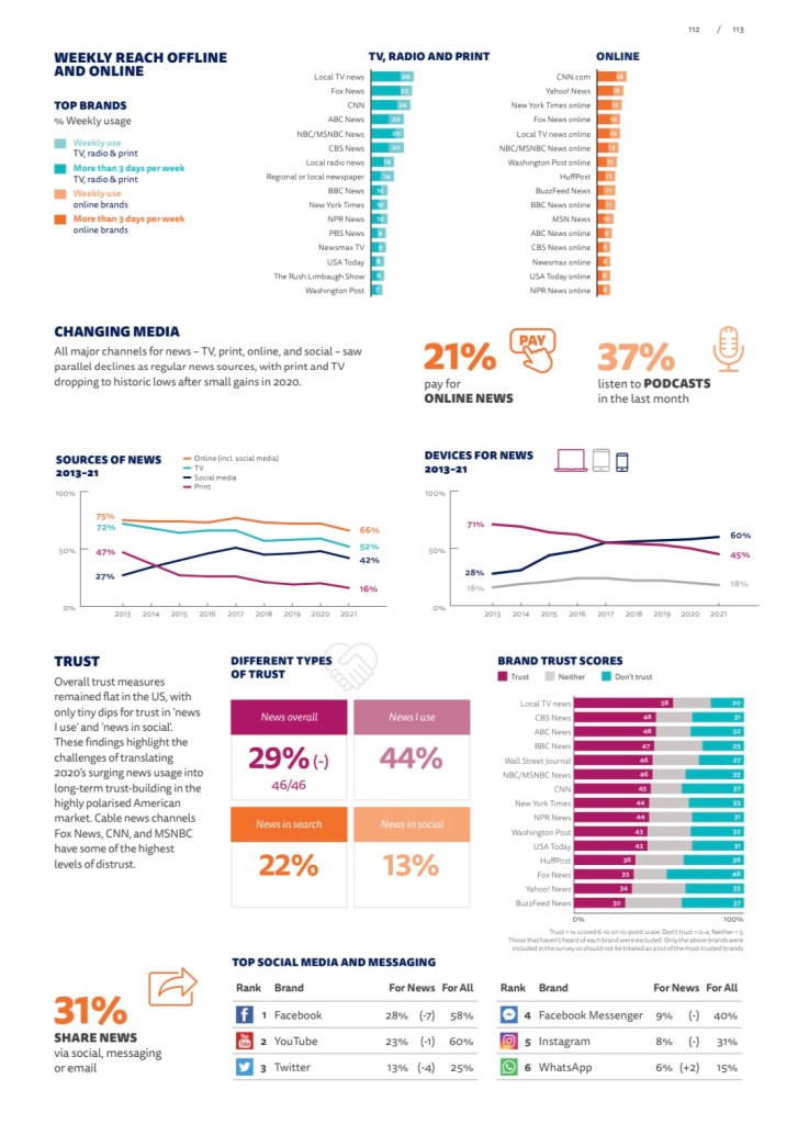 Reuters Institute has released its 10th Digital News Report. This report states only 29% of Americans trust the media out of 92,000 News Sources in 46 countries.
