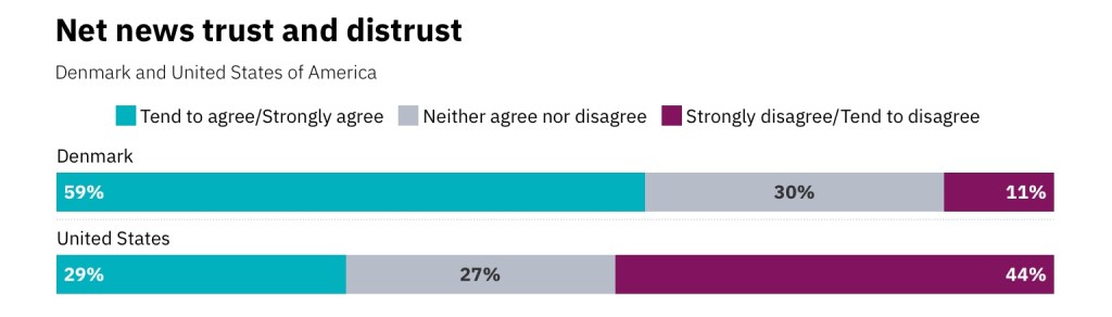 29% of Americans “Tend to Agree/Strongly Agree” with News Sources, while 44% of Americans “Tend to Disagree/Strongly Disagree”. 27% remains neutral on the issue, which either means they don’t watch the News, they watch multiple News Sources, or they are genuinely clueless about what is going on outside of their “safe-space bubble.” Denmark, seems to trust their News sources with 59% “Tend to Agree/Strongly Agree”. Denmark has a current population of approximately 5.8 million people. The United States of America has a current population of 332.4 million people. That is around 5631% more people. Nearly 90% of Denmark’s population is people of Danish descent.