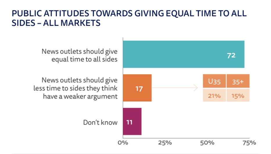 72% of people agree to giving Equal time to “All Side” of subjective News stories. 17% of people believe the News themselves should be in charge of who has “a weaker argument” and provide them with the ‘correct information’. 11% have no opinion on anything in their lives including who controls the narrative of the country they live in.