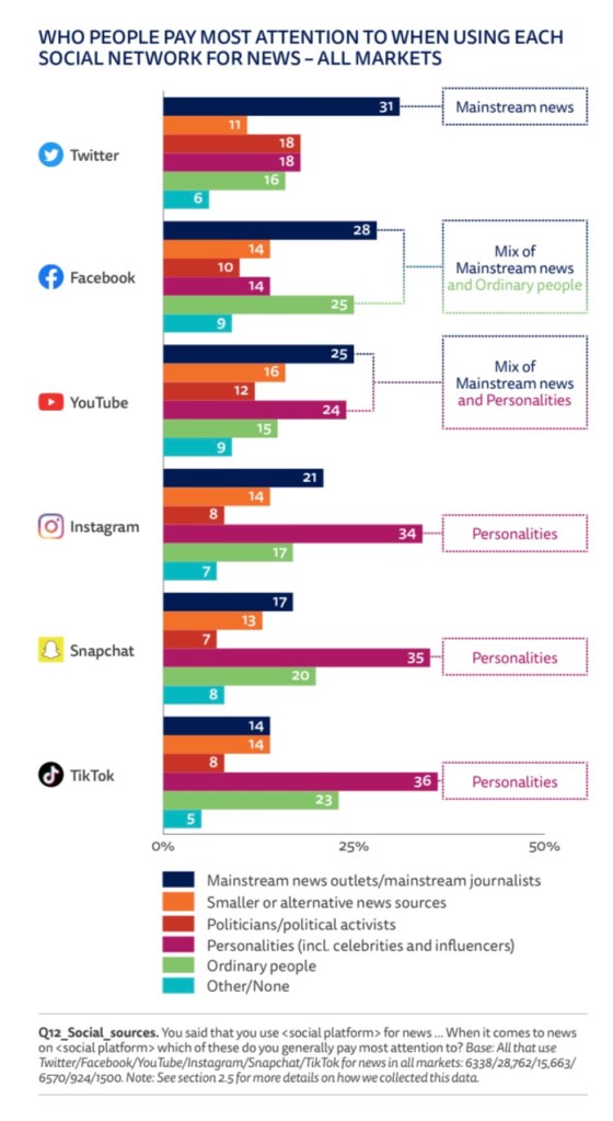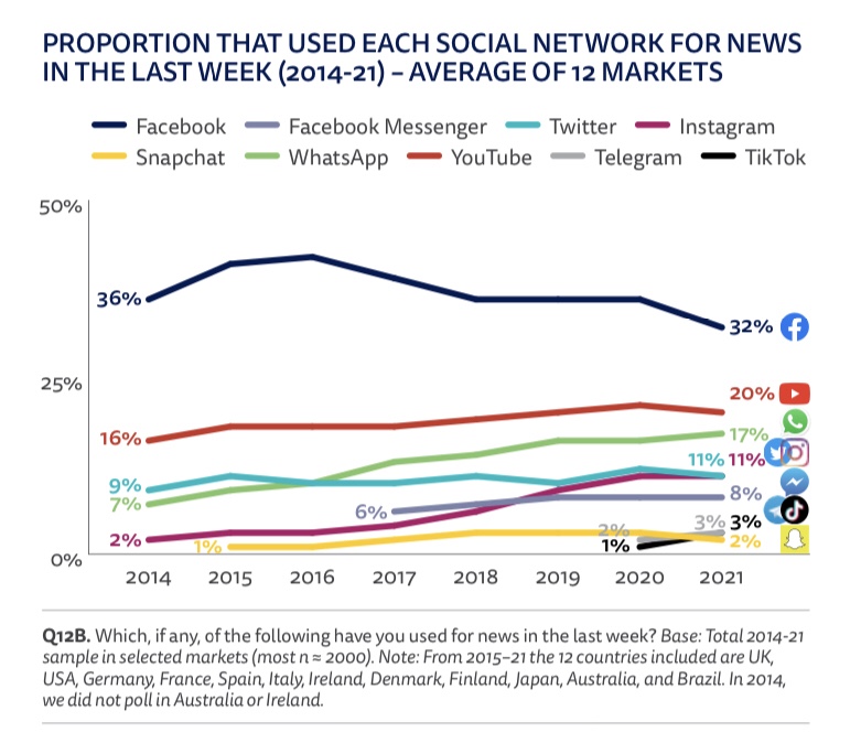 In a study involving 12 countries [USA, UK, Germany, France, Spain, Italy, Ireland, Denmark, Finland, Japan, Australia, and Brazil] revealed 32% of countries say Facebook is the number one source they find their “News”. 8% use Facebook Messenger for News bringing Facebook’s total to 40%. 20% say Youtube is second, with videos being uploaded from all major sources. 11% use Instagram, and another 11% use Twitter. The remaining lower % use TikTok, Telegram, and Snapchat.
