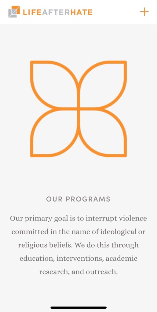 “Our Programs -Our primary goal is to interrupt violence committed in the name of ideological or religious beliefs. We do this through education, interventions, academic research, and outreach.”
