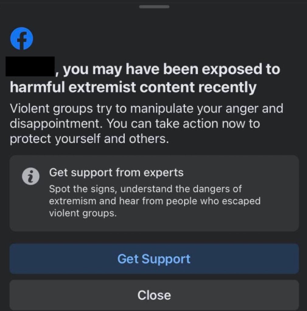 On Thursday, Facebook users began receiving notifications from Facebook alerting them they “may have been exposed to harmful extremist content”, with little indication of what the social media platform actually considers “extremist content”.