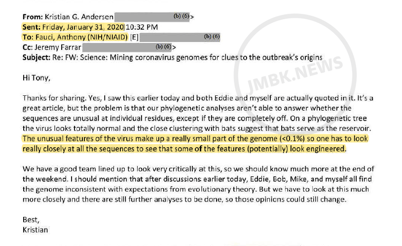 Below, an email found from January 31st, states “The unusual features of the virus make up a really small part of the genome (<0.1%) so one has to look really closely at all the sequences to see that some of the features (potentially) look engineered.”
