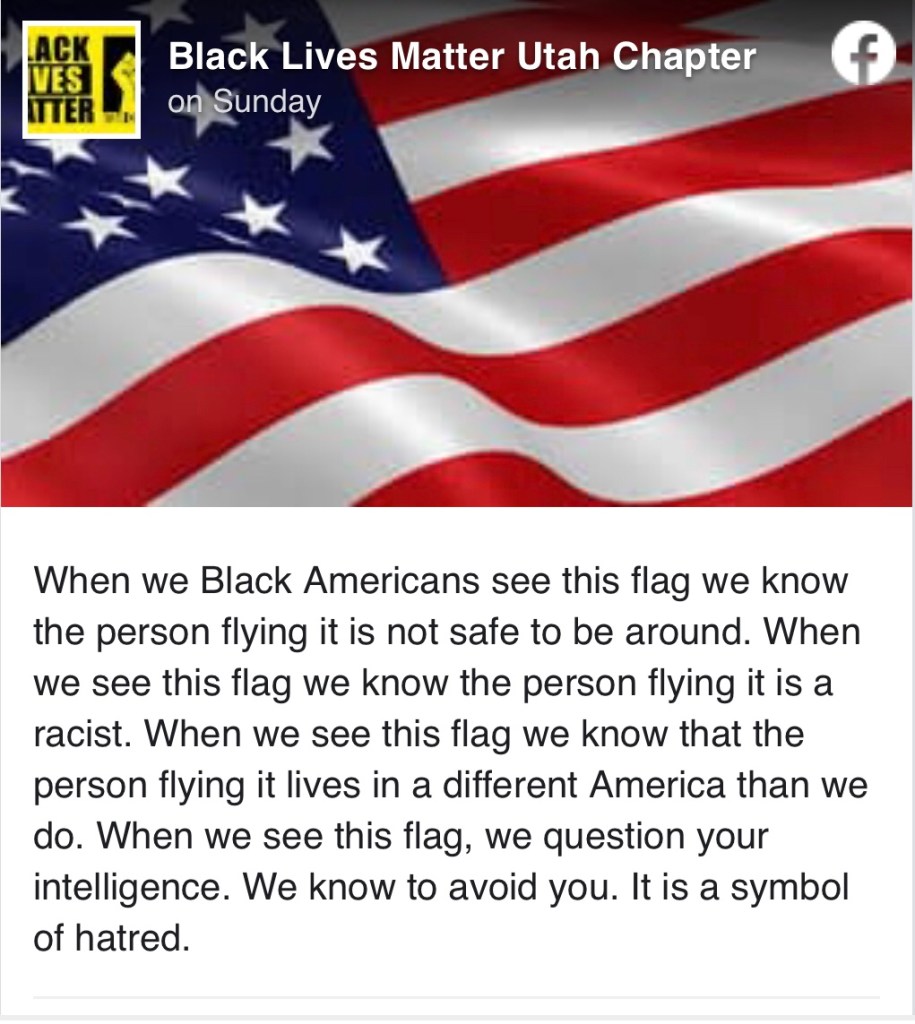 The Black Lives Matter Utah Chapter (BLM-UC) claimed in a Facebook post that the American Flag has now been designated as a “symbol of hate”.