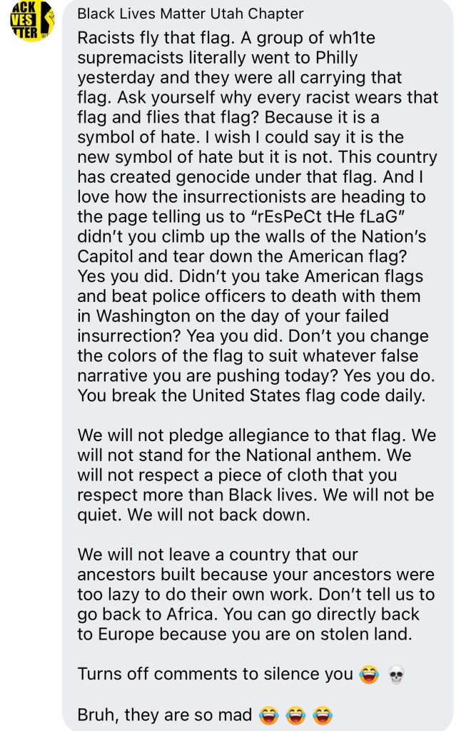 “Racists fly that flag.” the Utah Chapter proclaimed. “I wish I could say it is the new symbol of hate but it is not.” they continued “We will not leave a country our ancestors built because your ancestors were too lazy to do their own work. Don’t tell us to go back to Africa. You can go directly back to Europe because you are on stolen land.”