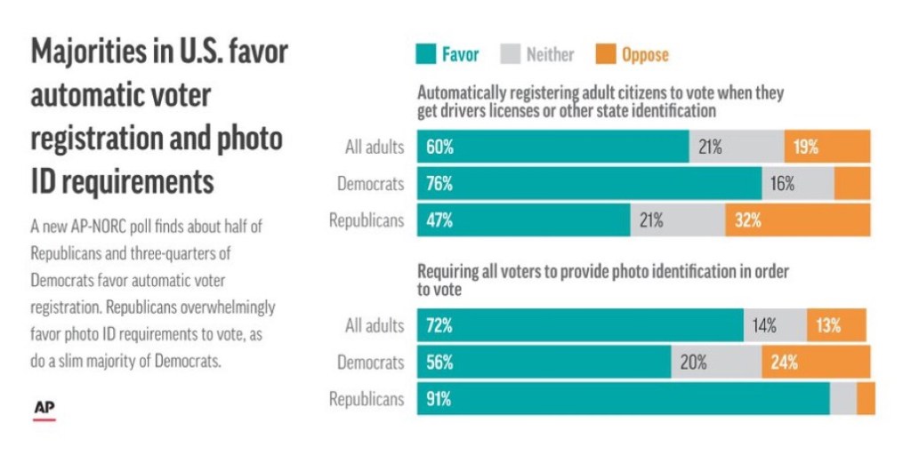 According to a poll by AP News 72% of all adults are in favor of requiring all voters to provide photo identification in order to vote.