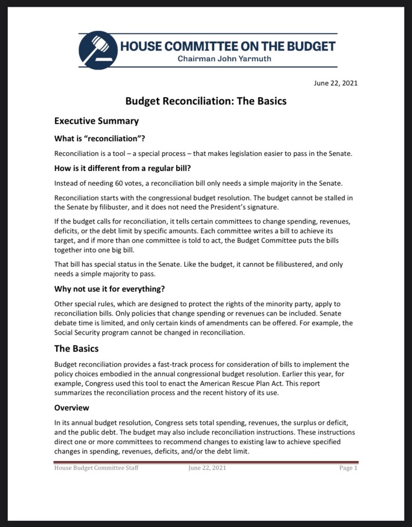 A [Budget] Reconciliation Bill—referred to as “Human Infrastructure”—can be permitted once per fiscal year, and can be used only to change existing laws related to taxes and spending. Senate rules require that most pieces of legislation get 60 votes, under the current Senate meaning all of the Democrats and 10 Republicans. However in the case of a budget reconciliation, the bill would require a simple majority of the senate to pass.