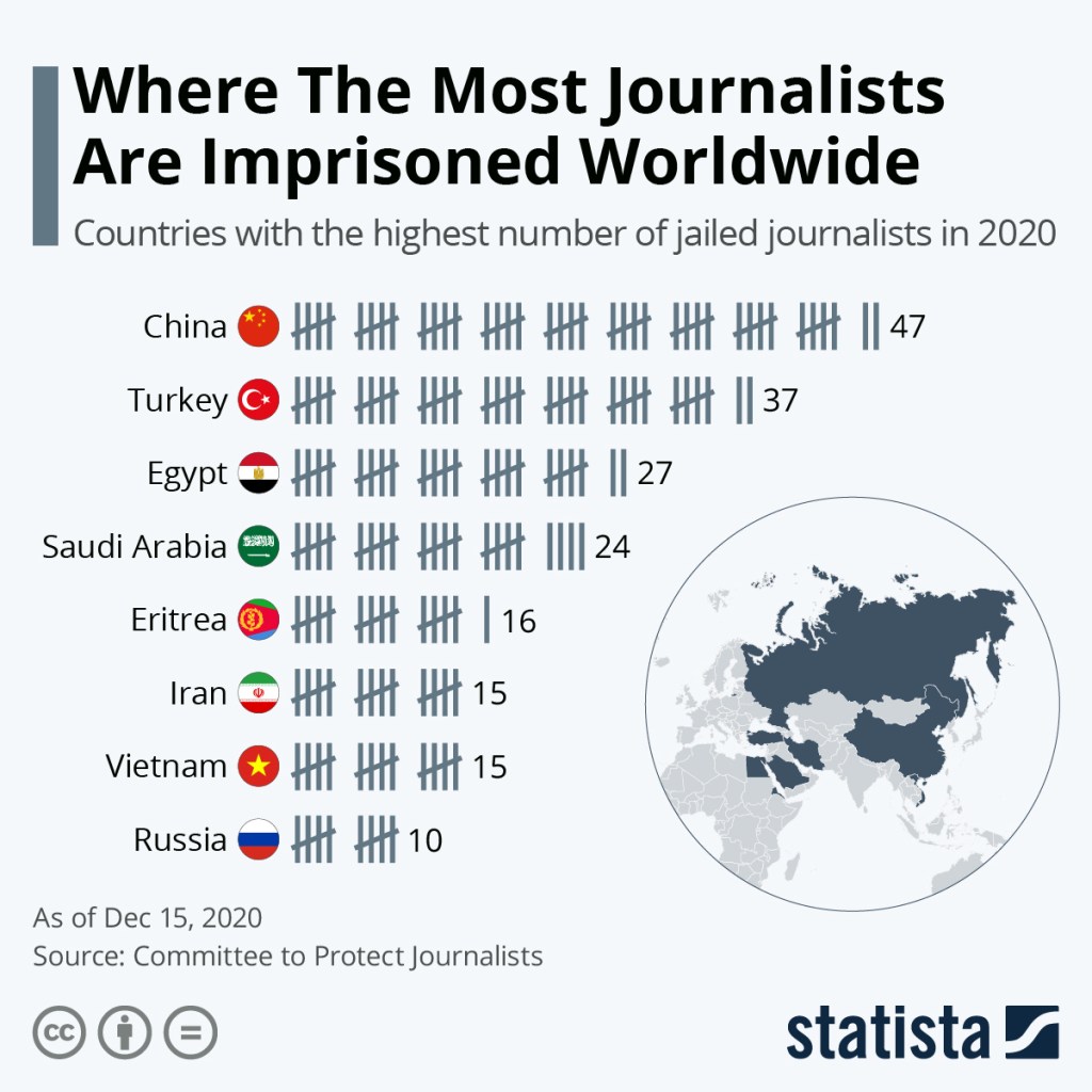 Currently China has the largest number of imprisoned Journalists. The Cyberspace Administration of China states China’s internet censorship is to “standardize and steer public accounts and information service platforms to be more self aware in maintaining the correct direction of public opinion,”