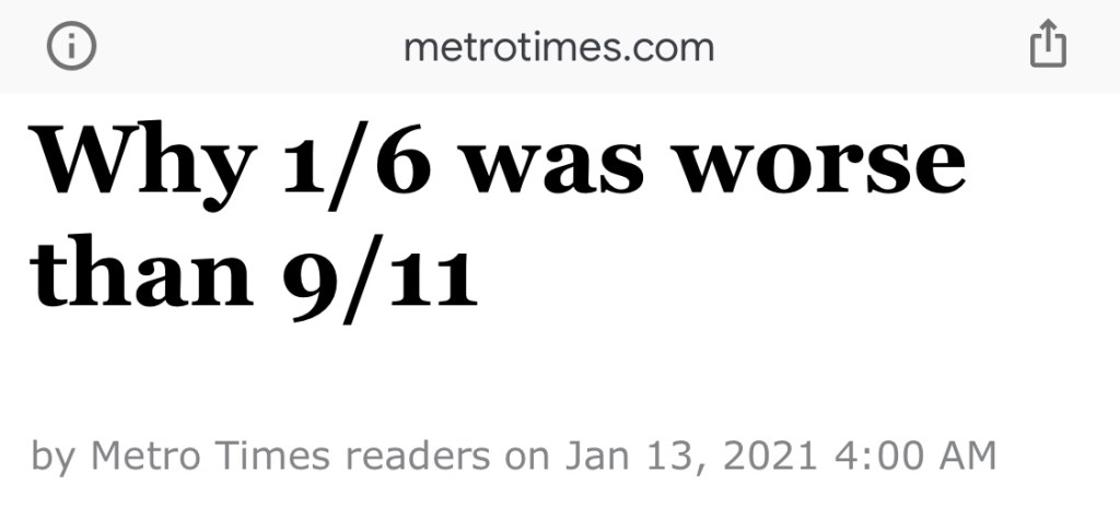 Is it fair to reduce the impact of 9/11, comparing to a media-exaggerated domestic event two decades later? Are 7 deaths comparable to 3000? Is 9/11 something we will begin to see used more frequently as a political weapon?