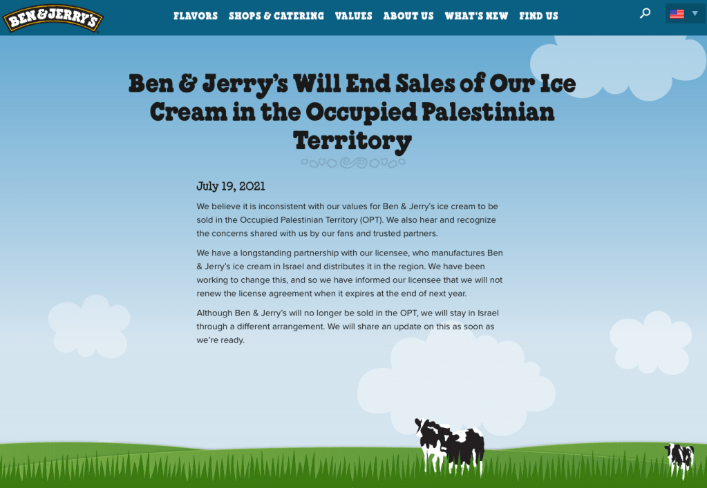 “We believe it is inconsistent with our values for Ben & jerry’s ice cream to be sold in the Occupied Palestinian Territory (OPT). We also hear and recognize the concerns shared by our fans and trusted partners.“