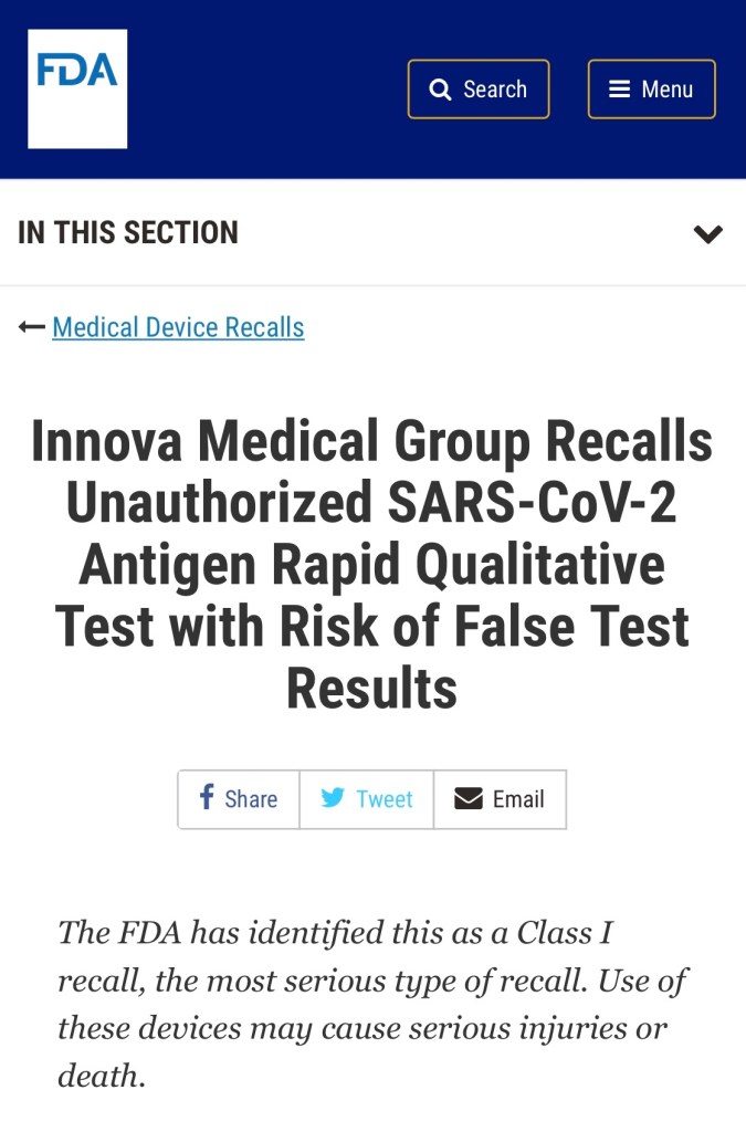Aside from false negatives due to mutuations, shockingly—these tests also produced False Positives. As stated in the FDA’s Recall: “False-positive results could also lead to further spread of the SARS-CoV-2 virus when presumed positive patients are grouped into cohorts based on false test results.”