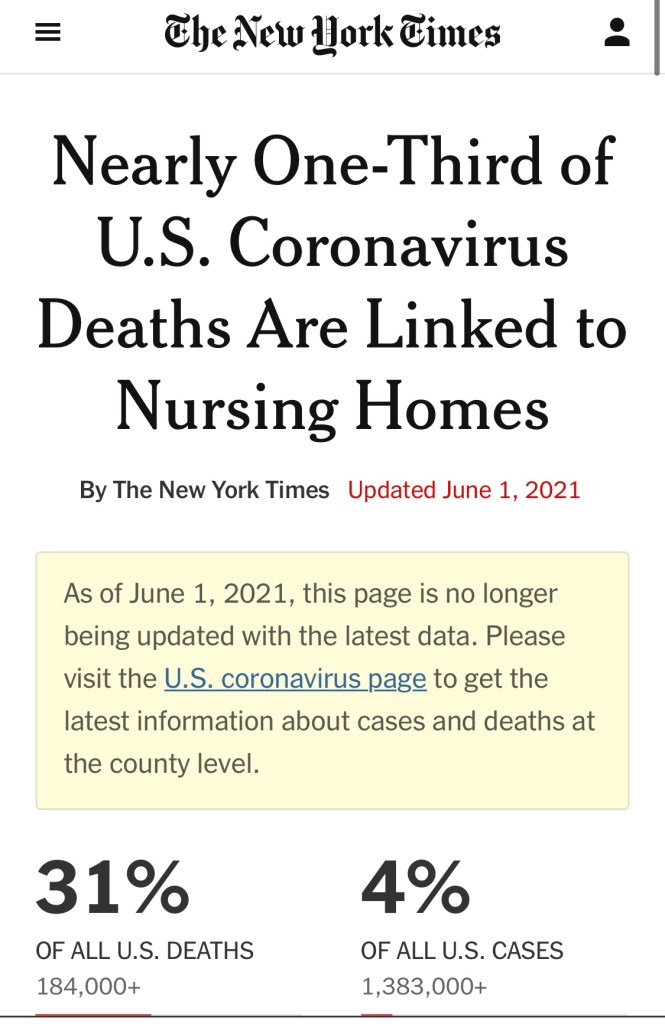 According to the New York Times, one-third of U.S. Coronavirus deaths are linked to Nursing Homes.