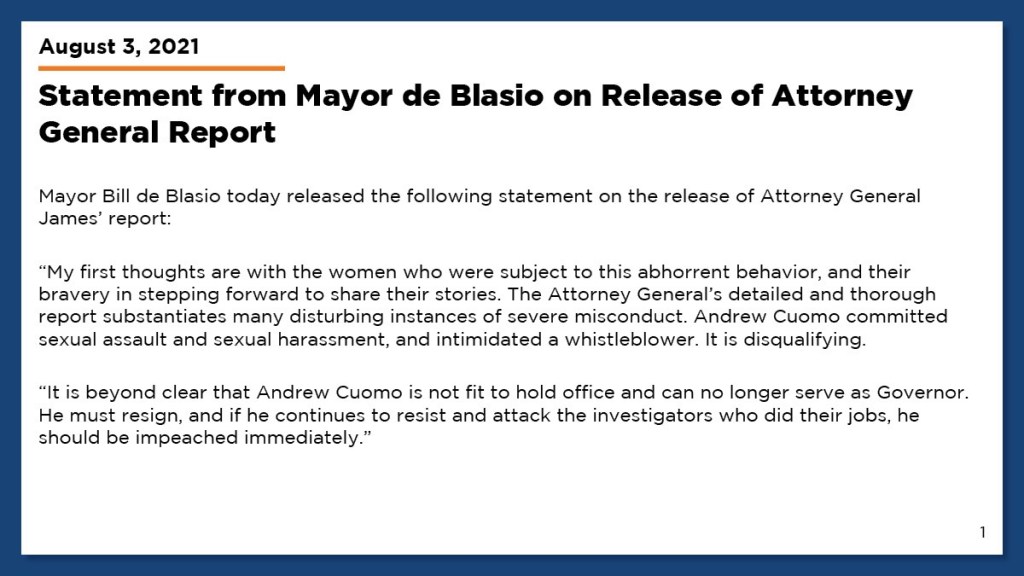 NYC Mayor Bill de Blasio released a statement, “ My first thoughts are with the women who were subject to the abhorrent behavior, and their bravery in stepping forward to share their stories. The Attorney General’s detailed and thorough report substantiates many disturbing instances of severe misconduct. Andrew Cuomo committed sexual assault and sexual harassment, and intimidated a whistleblower. It is disqualifying.”