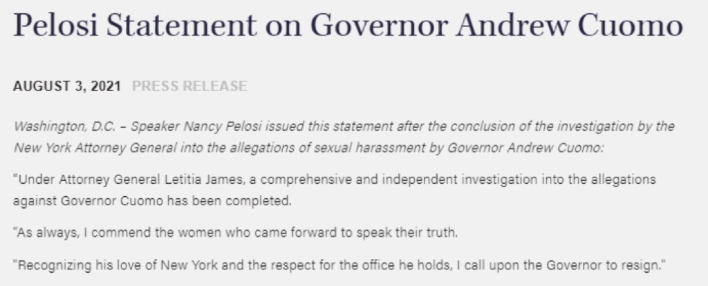 Nancy Pelosi issued a statement “Under Attorney General Letitia James, a comprehensive and independent investigation into the allegations against Governor Cuomo has been completed. As always, I commend the women who came forward to speak their truth. Recognizing his love of New York and the respect for the office he holds, I call upon the governor to resign”