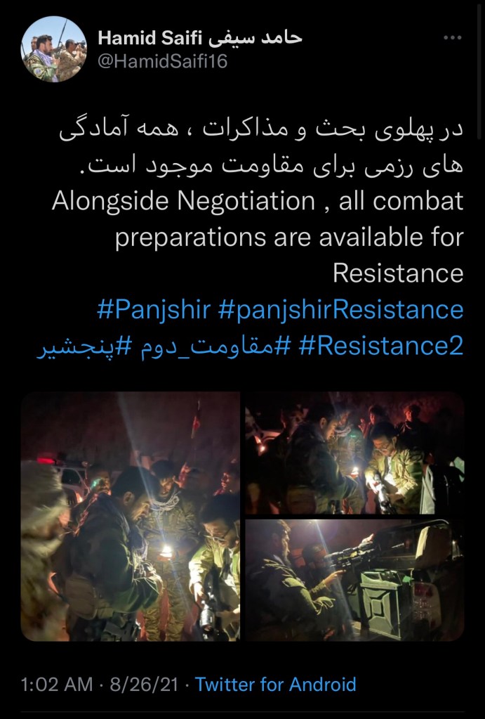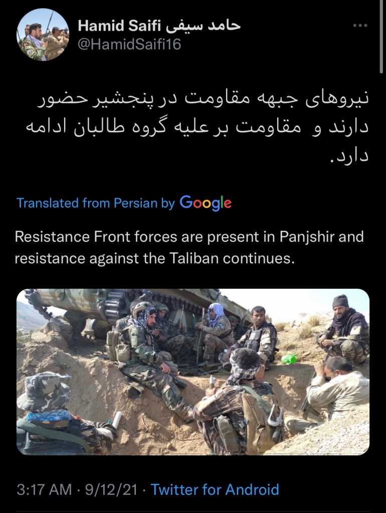 The patriotic militia from Panjshir, Afghanistan reports updates via Twitter their progress in eliminating violent Taliban presence within their country of Afghanistan. They do not seek the reliance of U.S. forces, and their mission is to take back Afghanistan.
