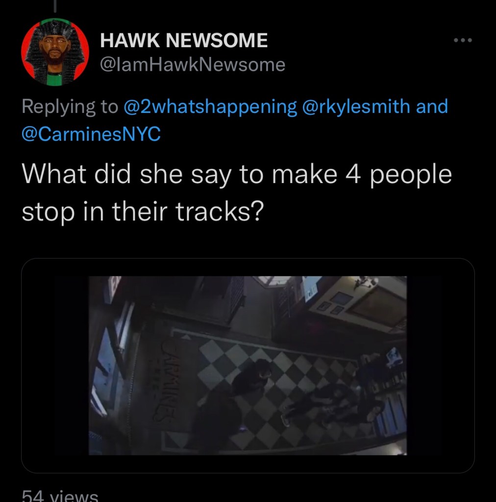 Co-Founder Hawk Newsome tweeted a response, “The truth is out. @CarminesNYC has changed there story 3 times. Now they’ve release the video you know why. They his behind the #VaccinePassport to conceal their employees abhorrent behavior. But we have more evidence. Just wait”