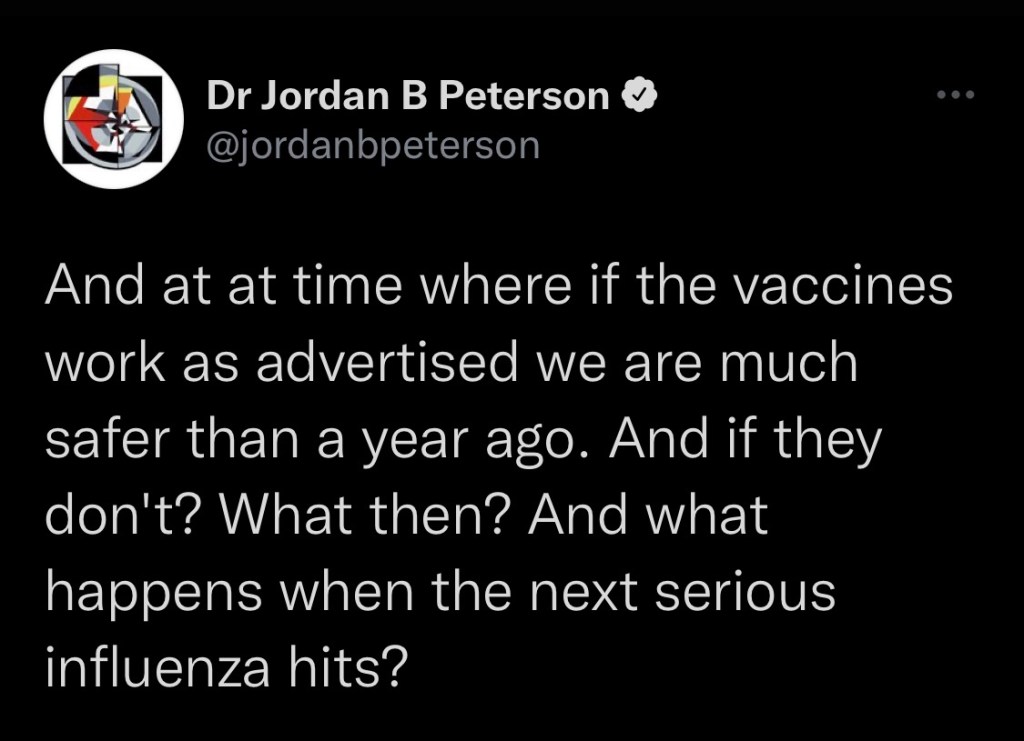 Dr. Peterson continued “And at a[t] time where if the vaccines work as advertised we are much safer than a year ago. And if they don’t? And what happens when the next influenza hits?”