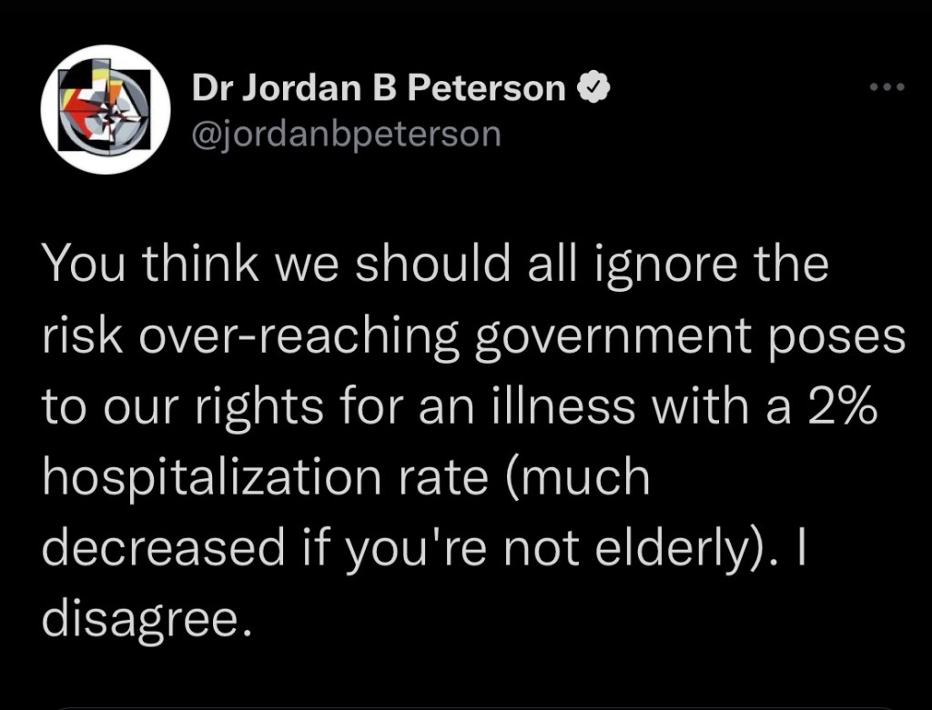 Speaking on individual rights Dr. Jordan Peterson stated, “You think we should all ignore the risk over-reaching government poses to our rights for an illness with a 2% hospitalization rate (much decreased if you’re not elderly). I disagree.”