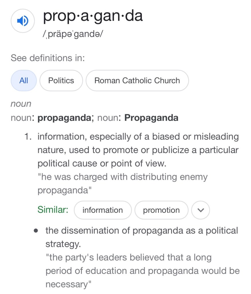 Dictionary.com defines the world “propaganda” as ,