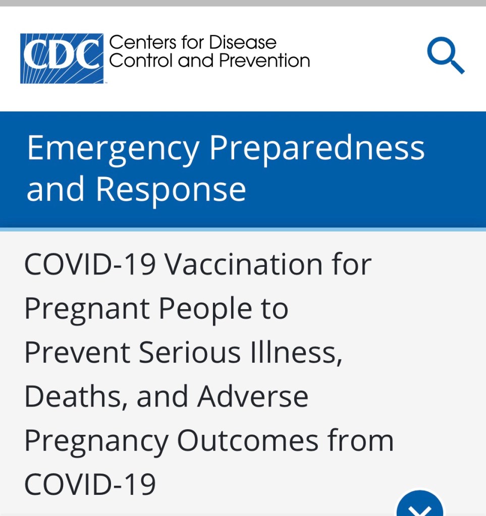 “COVID-19 vaccination is recommended for pregnant people. CDC recommends COVID-19 vaccination for all people aged 12 years and older, including people who are pregnant, recently pregnant (including those who are lactating), who are trying to get pregnant now, or who might become pregnant in the future.4 CDC recommendations align with those from professional medical organizations serving people who are pregnant, including the American College of Obstetricians and Gynecologistsexternal icon and the Society for Maternal-Fetal Medicinepdf iconexternal icon. Accumulating data provide evidence of both the safety and effectiveness of COVID-19 vaccination in pregnancy. CDC strongly recommends COVID-19 vaccination either before or during pregnancy, because the benefits of vaccination for both pregnant persons and their fetus/infant outweigh known or potential risks. Getting a COVID-19 vaccine can prevent severe illness, death, and pregnancy complications related to COVID-19.”