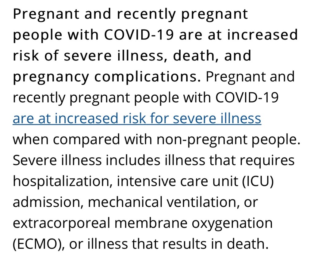 “Pregnant and recently pregnant people with COVID-19 are at increased risk of severe illness, death, and pregnancy complications. Pregnant and recently pregnant people with COVID-19 are at increased risk for severe illness when compared with non-pregnant people. Severe illness includes illness that requires hospitalization, intensive care unit (ICU) admission, mechanical ventilation, or extracorporeal membrane oxygenation (ECMO), or illness that results in death. Although the absolute risk is low, compared with non-pregnant symptomatic people, symptomatic pregnant people have more than a two-fold increased risk of requiring ICU admission, invasive ventilation, and ECMO, and a 70% increased risk of death.6Pregnant people with COVID-19 are also at increased risk for preterm birth and some data suggest an increased risk for other adverse pregnancy complications and outcomes, such as preeclampsia, coagulopathy, and stillbirth, compared with pregnant people without COVID-19.7-10 Neonates born to people with COVID-19 are also at increased risk for admission to the neonatal ICU.9-11 In addition, although rare, pregnant people with COVID-19 can transmit infection to their neonates; among neonates born to women with COVID-19 during pregnancy, 1–4% of neonates tested were positive by rRT-PCR.”
