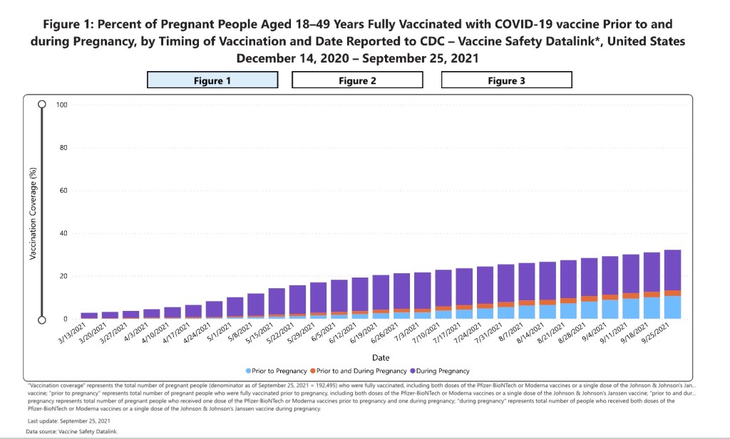 “The Centers for Disease Control and Prevention (CDC) recommends urgent action to increase Coronavirus Disease 2019 (COVID-19) vaccination among people who are pregnant, recently pregnant (including those who are lactating), who are trying to become pregnant now, or who might become pregnant in the future. CDC strongly recommends COVID-19 vaccination either before or during pregnancy because the benefits of vaccination outweigh known or potential risks. As of September 27, 2021, more than 125,000 laboratory-confirmed COVID-19 cases have been reported in pregnant people, including more than 22,000 hospitalized cases and 161 deaths. The highest number of COVID-19-related deaths in pregnant people (n=22) in a single month of the pandemic was reported in August 2021. Data from the COVID-19-Associated Hospitalization Surveillance Network (COVID-NET) in 2021 indicate that approximately 97% of pregnant people hospitalized (either for illness or for labor and delivery) with confirmed SARS-CoV-2 infection were unvaccinated.2 In addition to the risks of severe illness and death for pregnant and recently pregnant people, there is an increased risk for adverse pregnancy and neonatal outcomes, including preterm birth and admission of their neonate(s) to an intensive care unit (ICU). Other adverse pregnancy outcomes, such as stillbirth, have been reported. Despite the known risks of COVID-19, as of September 18, 2021, 31.0% of pregnant people were fully vaccinated before or during their pregnancy.3 In addition, there are racial and ethnic disparities in vaccination coverage for pregnant people. Healthcare providers should communicate the risks of COVID-19, the benefits of vaccination, and information on the safety and effectiveness of COVID-19 vaccination in pregnancy. Healthcare providers should strongly recommend that people who are pregnant, recently pregnant (including those who are lactating), who are trying to become pregnant now, or who might become pregnant in the future receive one of the authorized or approved COVID-19 vaccines as soon as possible.”