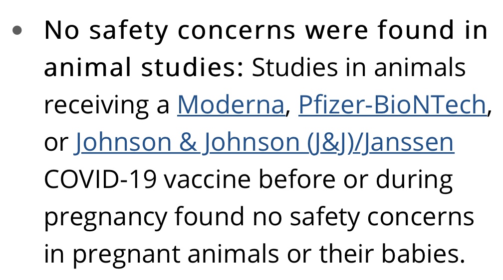“No safety concerns were found in animal studies: Studies in animals receiving a Moderna, Pfizer-BioNTech, or Johnson & Johnson Covid-19 vaccine before or during pregnancy found no safety concerns in pregnant animals or their babies”