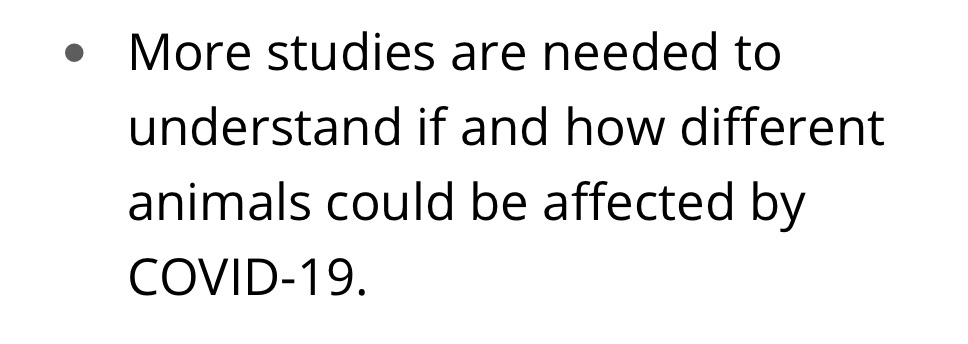 “At this time, there is no evidence that animals play a significant role in spreading SARS-CoV-2, to people. More studies are needed to understand if and how different animals could be affected by SARS-CoV-2.”