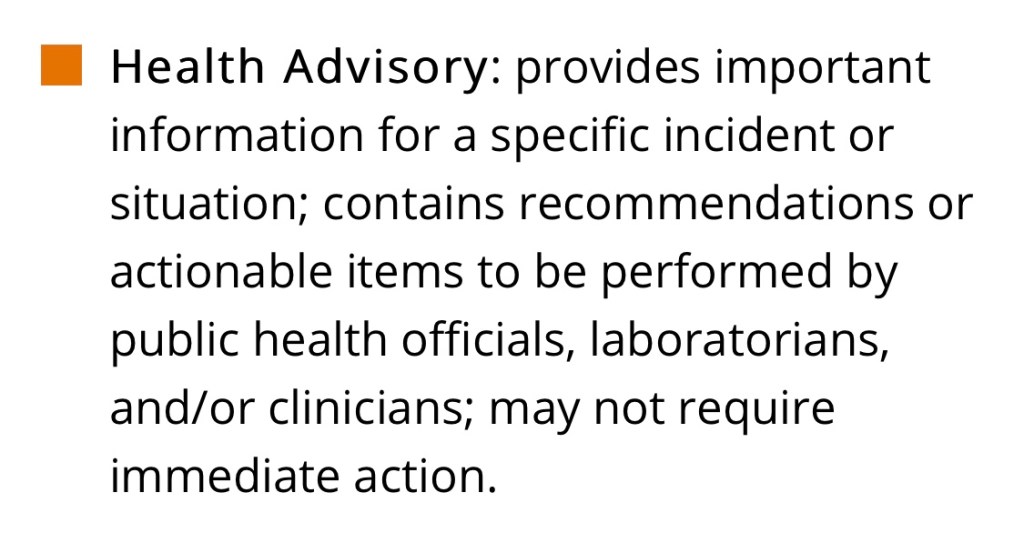 [Orange] CDC Health Advisory: “provides important information for a specific incident or situation; contains recommendations or actionable items to be performed by pubic health officials, laboratorians, and/or clinicians; may not require immediate action.”