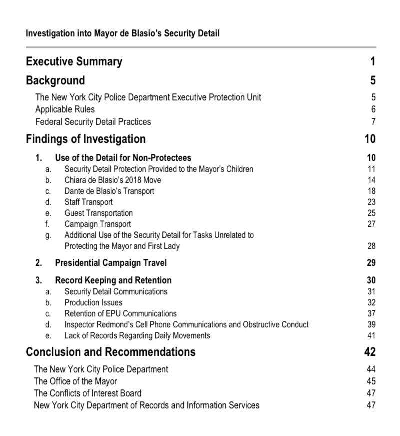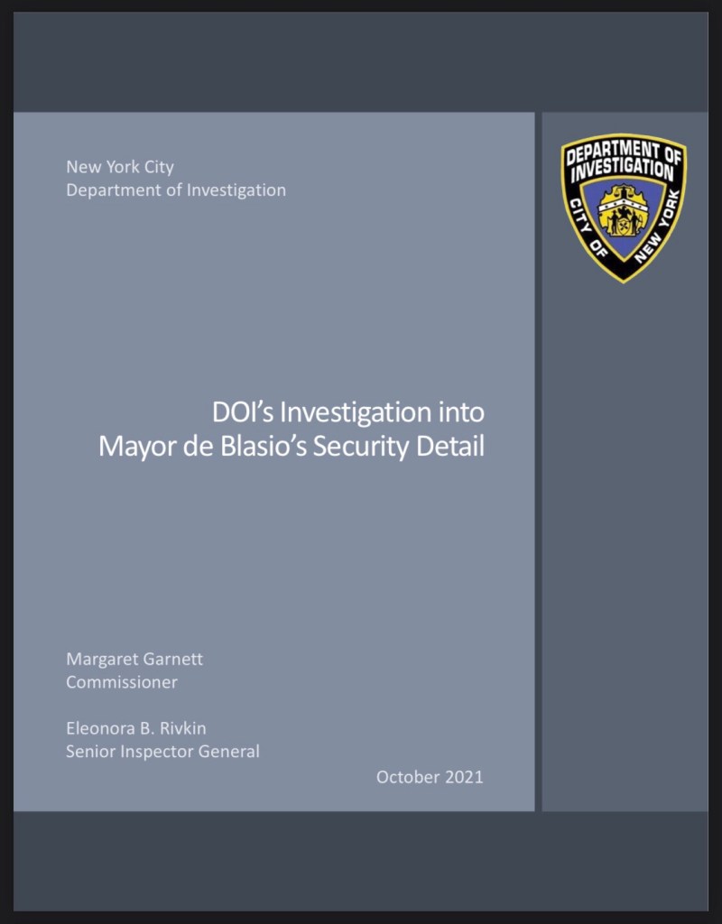 The 49-page report reads, “In the course of this investigation, DOI identified several vulnerabilities concerning the operation of Mayor de Blasio’s security detail, particularly regarding official communications, compliance with record retention protocols, and a culture susceptible to abuse.”