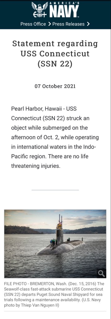 The Navy responded in a statement, “Pearl Harbor, Hawaii – USS Connecticut (SSN 22) struck an object while submerged on the afternoon of Oct. 2, while operating in international waters in the Indo-Pacific region. There are no life threatening injuries.”