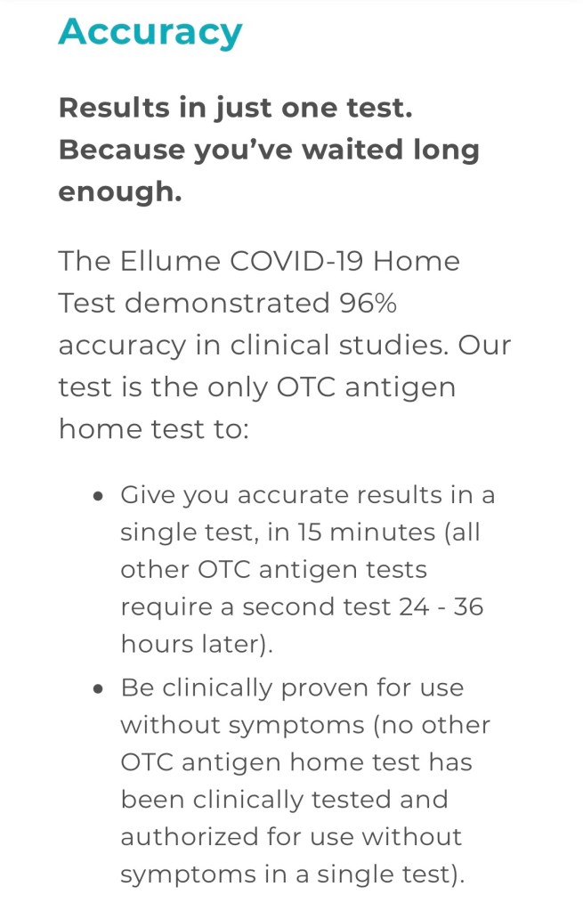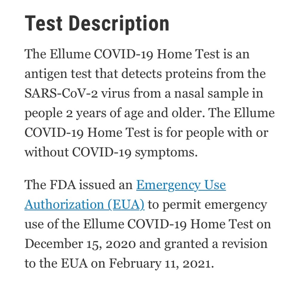 “The Ellume COVID-19 Home Test has not been FDA cleared or approved; but has been authorized by the FDA under an emergency use authorization. This product has been authorized only for the detection of proteins from SARS-CoV-2, not for any other viruses or pathogens, and is only authorized for the duration of the declaration that circumstances exist justifying the authorization of emergency use of in vitro diagnostics for detection and/or diagnosis of COVID-19 under Section 564(b)(1) of the Federal Food, Drug and Cosmetic Act, 21 U.S.C. § 360bbb-3(b)(1), unless the declaration is terminated or authorization is revoked sooner. Ⓒ Ellume Limited 2021”