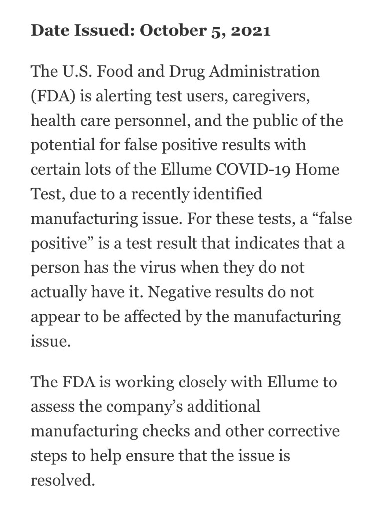 The U.S. Food and Drug Administration (FDA) alerted “test users, caregivers, health care personnel, and the public of the potential for false positive results with certain lots of the Ellume COVID-19 Home Test, due to a recently identified manufacturing issue.”