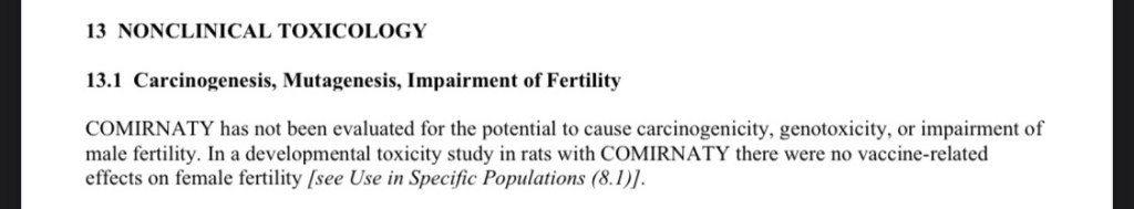 The package insert states that COMIRNATY “has not been evaluated for the potential to cause carcinogenicity, genotoxicity, or impairment of male fertility.” However it states that “[i]n a developmental toxicity study in rats” there were “no vaccine-related effects on female [rat] fertility”