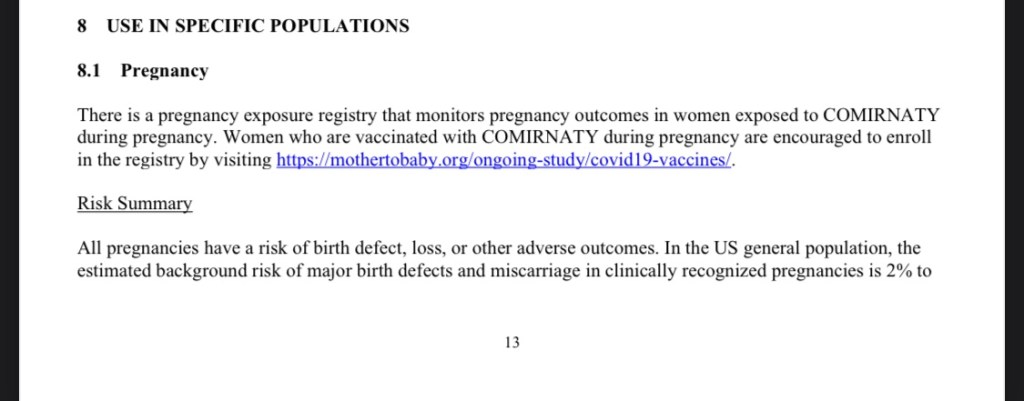 FDA propaganda now suggests all pregnant women should get vaccinated with a coronavirus vaccine. The package insert for the COMIRNATY drug also states that “All pregnancies have a risk of birth defect, loss, or other adverse outcomes.”
