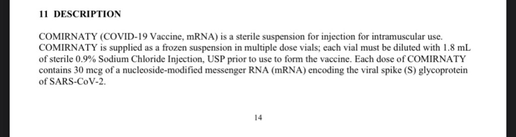 - 30 mcg of a nucleoside-modified messenger RNA (mRNA) encoding the viral spike (S) glycoprotein of SARS-CoV-2.