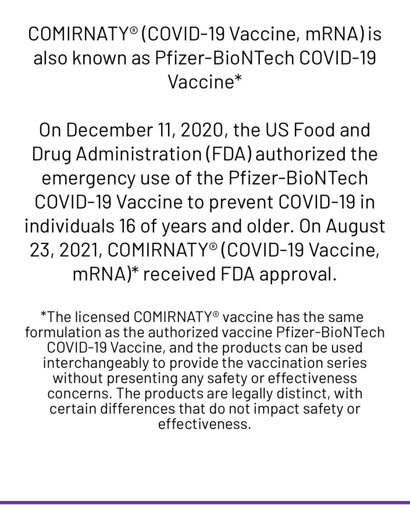 Although both vaccines have similar formulas, COMIRNATY is treated as a separate product under U.S. law.