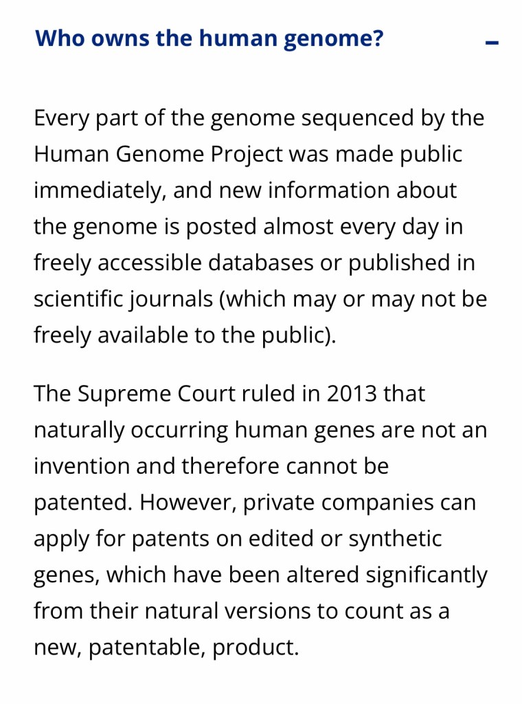 The National Human Genome Research Institute’s website states, “private companies can apply for patents on edited or synthetic genes, which have been altered significantly from their natural versions to count as a new, patentable, product.”
