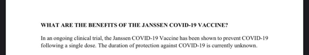 The benefits, as described “prevent COVID-19 following a single dose”, however “[t]he duration of protection against COVID-19 is currently unknown.”