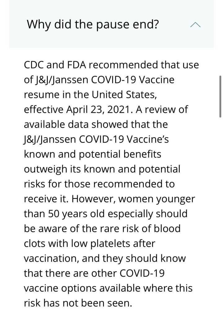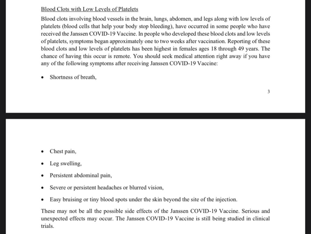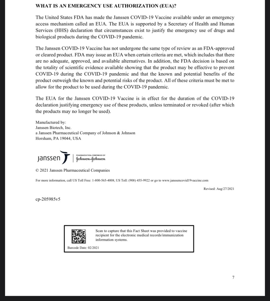 “These may not be all the possible side effects of Janssen COVID-19 Vaccine. Serious and unexpected effects may occur. The Janssen COVID-19 Vaccine is still being studied in clinical trials.” reads the EUA fact sheet.