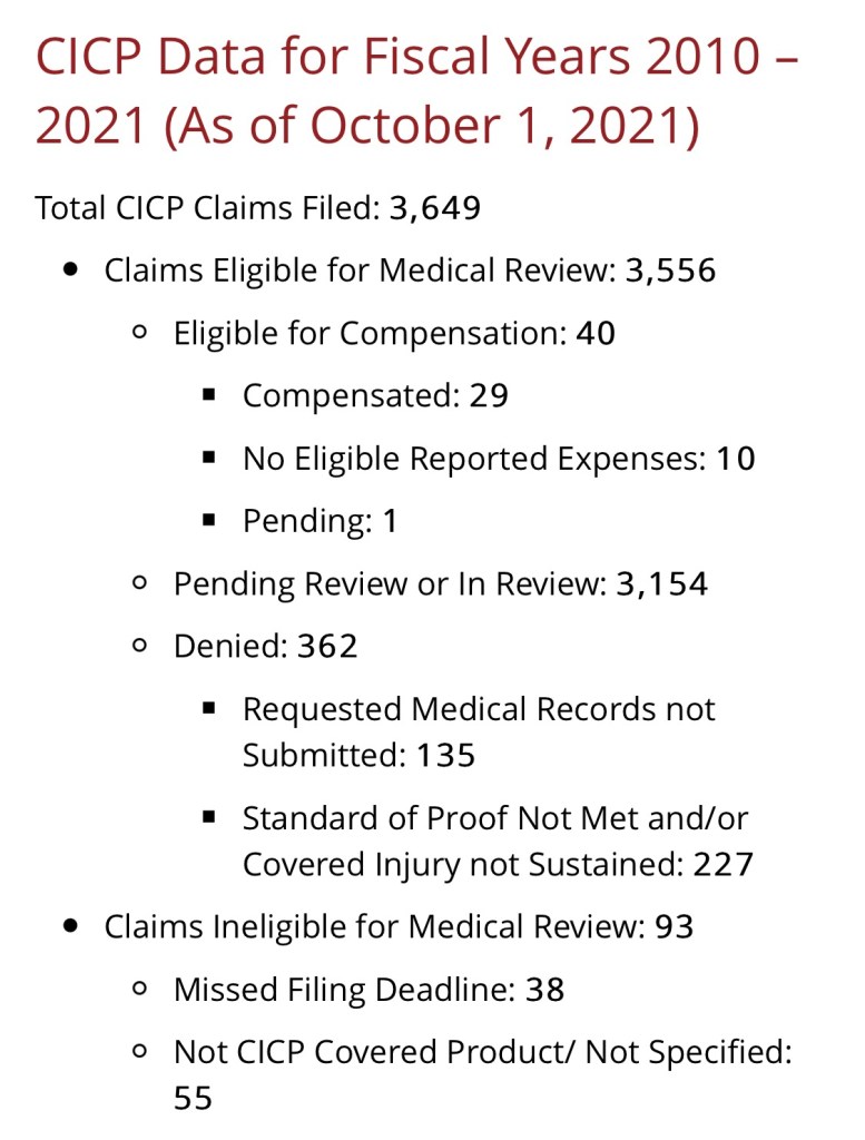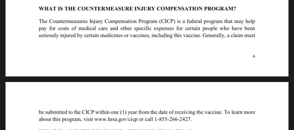 The Countermeasures Injury Compensation Program (CICP) “is a federal program that may help pay for costs of medical care and other specific expenses for certain people who have been seriously injured by certain medicines or vaccines, including this vaccine.”