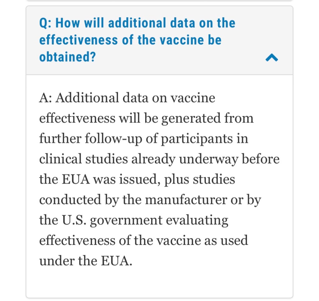 Johnson & Johnson’s official website states, “[S]tudies conducted by the manufacturer or by the U.S. government evaluating effectiveness of the vaccine as used under the EUA”