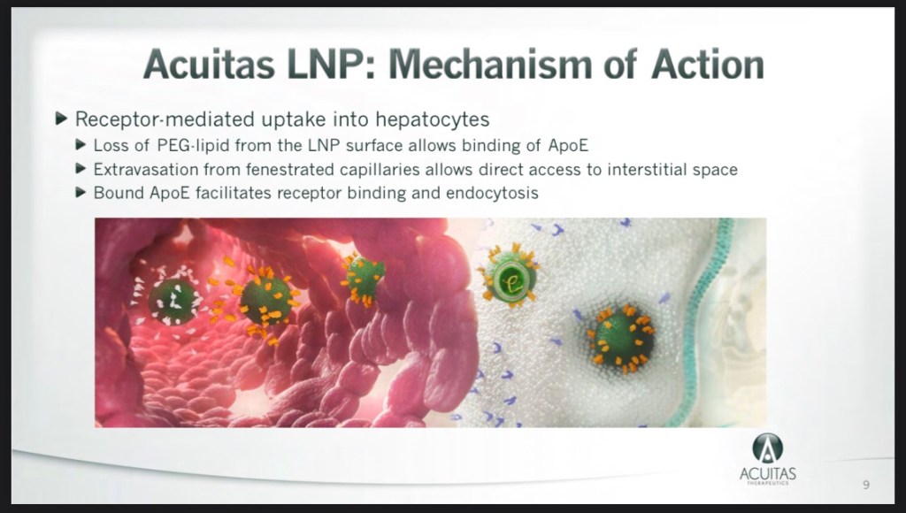- Nanoparticles pass through the cell membrane and the acid from the cell begins dissolving the outer layer [PEG] of the nanoparticle. The loss of PEG-lipid from the LNP surface allows binding.