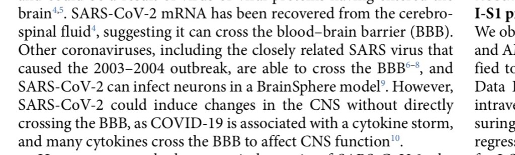 According a report from nature.com, “SARS-CoV-2 mRNA has been recovered from the cerebrospinal fluid, suggesting it can cross the blood–brain barrier (BBB). Other coronaviruses, including the closely related SARS virus that caused the 2003–2004 outbreak, are able to cross the BBB, and SARS-CoV-2 can infect neurons in a BrainSphere model.”