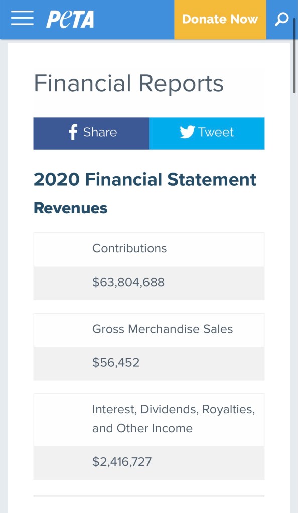 PETA’s 2020 financial reports show $63,804,688 in “Contributions”, as well as $53,542 in gross merchandise sales. During that year, PETA also received $2,416,727 in Interest, Dividends, Royalties, and “Other Income”.