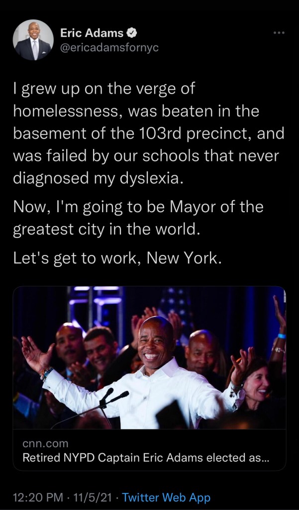 Eric Adams announced his victory on Twitter stating “Now, let’s get to work”. New York City can only anticipate the meaning of the future mayor’s words. This victory marks a new era, Eric Adams, the new mayor of NYC.