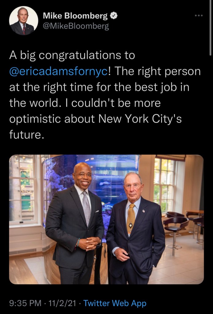 Former NYC Mayor Michael Bloomberg, supporter and investor in the Chinese Communist Party, tweeted his support of Eric Adams, stating he was “[t]he right person at the right time for the best job in the world.”. Bloomberg’s reign over NYC lasted from 2002-2013.