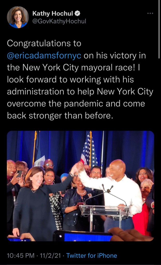 While Eric Adams remains focused on important priorities throughout the city, we can only wait to see how his strategy correlates with NYC’s progressive Kathy Hochul. Will Eric Adams improve small businesses and strengthen the working class of New York? Is Eric Adams’s agenda geared towards invisible progress, or will the citizens of New York, who need it most, see a positive change in the state? Will eastern philosophies like socialism (and ultimately communism) continue to be introduced into the state of New York? Or, will western values like capitalism, and self reliance be offered again as sustainable options for it’s citizens, fueling New York’s reviving economy?