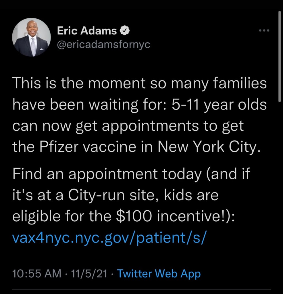 Eric Adams believes children as young as five years old should receive the coronavirus concoction, stating “kids are eligible for the $100 incentive!”. To create statistical data in order to encourage this belief, New York City’s Pfizer tested the effects of the injections in experimental human trials using 2,268 children aged 5 – 11.