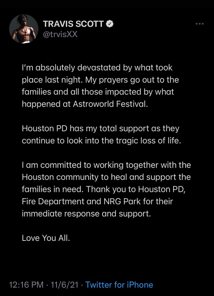 Travis Scott responded on Twitter stating: